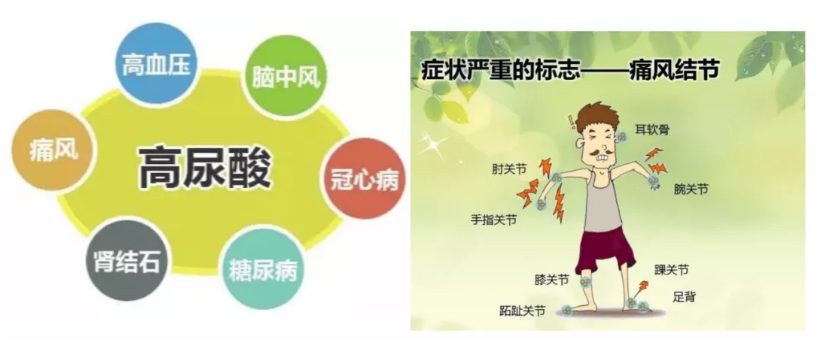 高尿酸的危害 尿酸过高会导致尿酸盐结晶沉积,损伤你的多个组织器官,如慢性肾病、肾结石、糖尿病、高血压、中风等心脑血管疾病。