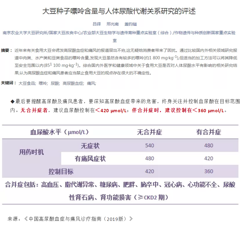 随着生活水平的提高,高尿酸血症和痛风患者人数不断攀升,我国13.3%的成年人患有高尿酸血症。大多数高尿酸、痛风患者都会“谈豆色变”,认为:豆制品嘌呤含量高,高尿酸血症和痛风都不能吃....今天,陕西省中医医院营养科专家以《中国高尿酸血症与痛风诊疗指南(2019版)》为参考,给大家讲一讲高尿酸、痛风患者能不能吃豆制品?得了高尿酸、痛风要怎么吃?