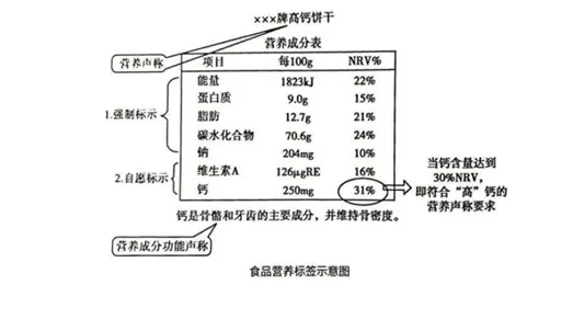 ③营养成分功能声称:凡是进行营养成分功能声称的食品都应在营养成分表中列出相应的营养成分含量,并符合声称条件。使用规定以外的声称用语均被视为违反国家标准,如:“钙有助于骨骼和牙齿更坚固”。