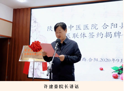 许建秦院长在讲话中表示,省中医医院作为三级甲等中医医院,学科特色和技术优势突出,与合阳县中医医院建立医联体,标志着两家医院进入到了一个紧密互助的发展阶段。将充分发挥医疗资源效能,采取点对点、科对科、人对人的形式,以学科建设带动医院整体中医药服务能力和水平的全面提升。希望通过雷忠义国医大师合阳工作站这个纽带,通过中医药专家定期到合阳县中医医院开展诊疗、带教工作,以传帮带的形式,提升合阳县中医医院中医药人才队伍的建设和培养,进一步提高医院的中医药服务能力和水平,努力为保障人民群众的身体健康,做出应有的贡献。