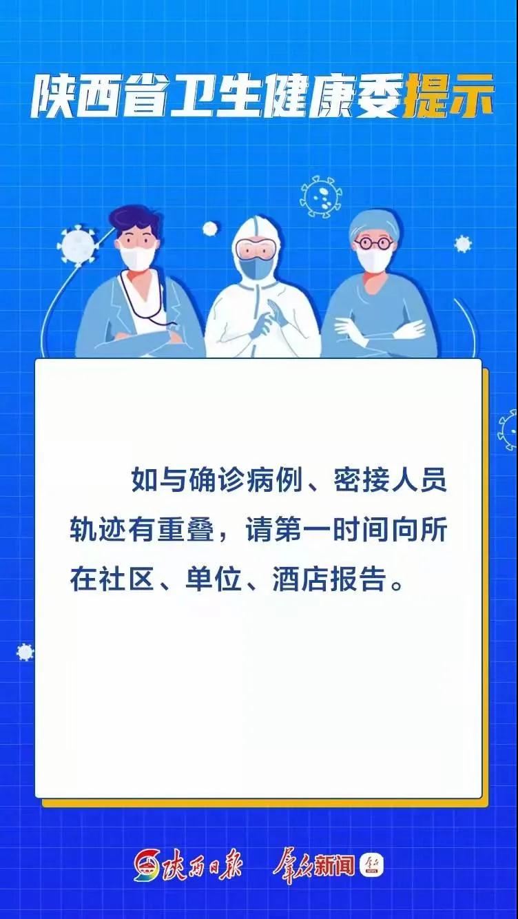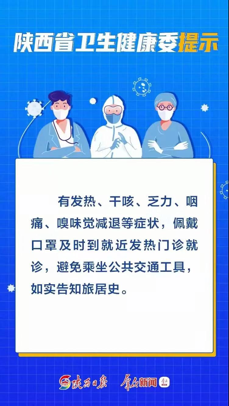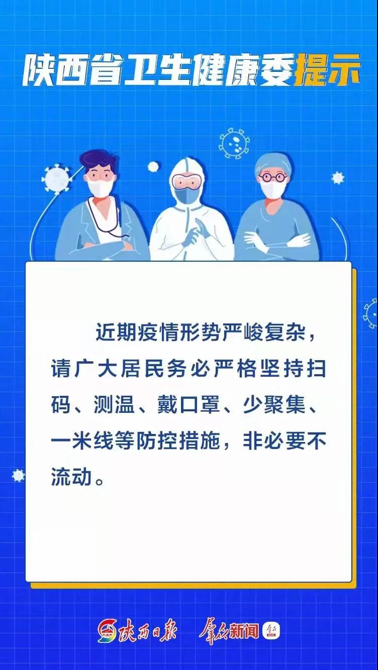 陕西省卫生健康委提示:近期疫情形势严峻复杂,请广大居民务必严格坚持扫码、测温、戴口罩、少聚集、一米线等防控措施,非必要不流动。有发热、干咳、乏力、咽痛、嗅味觉减退等症状,佩戴口罩及时到就近发热门诊就诊,避免乘坐公共交通工具,如实告知旅居史。如与确诊病例、密接人员轨迹有重叠,请第一时间向所在社区、单位、酒店报告。