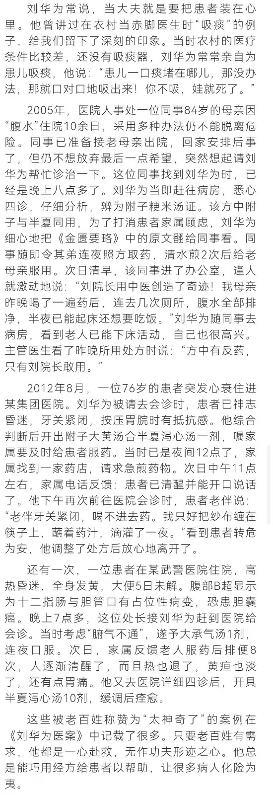 2005年,医院人事处一位同事84岁的母亲因“腹水”住院10余日,采用多种办法仍不能脱离危险。同事已准备接老母亲出院,回家安排后事了,但仍不想放弃最后一点希望,突然想起请刘华为帮忙诊治一下。这位同事找到刘华为时,已经是晚上八点多了。刘华为当即赶往病房,悉心四诊,仔细分析,辨为附子粳米汤证。该方中附子与半夏同用,为了打消患者家属顾虑,刘华为细心地把《金匮要略》中的原文翻给同事看。同事随即令其弟连夜照方取药,清水煎2次后给老母亲服用。次日清早,该同事进了办公室,逢人就激动地说:“刘院长用中医创造了奇迹!我母亲昨晚喝了一遍药后,连去几次厕所,腹水全部排净,半夜已能起床还想要吃饭。”刘华为随同事去病房,看到老人已能下床活动,自己也很高兴。主管医生看了昨晚所用处方时说:“方中有反药,只有刘院长敢用。”