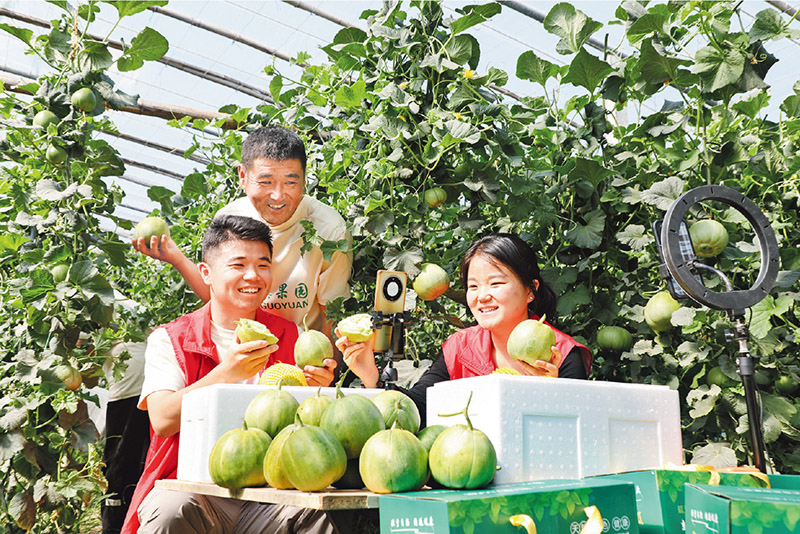 各地党员、干部大力发扬密切联系群众的作风,立足岗位担当作为、服务群众。图为2025年5月11日,河南省新乡市延津县南秦庄村甜瓜种植大棚内,党员志愿者通过现场直播,帮助农户推销甜瓜。 人民图片 张燕/摄