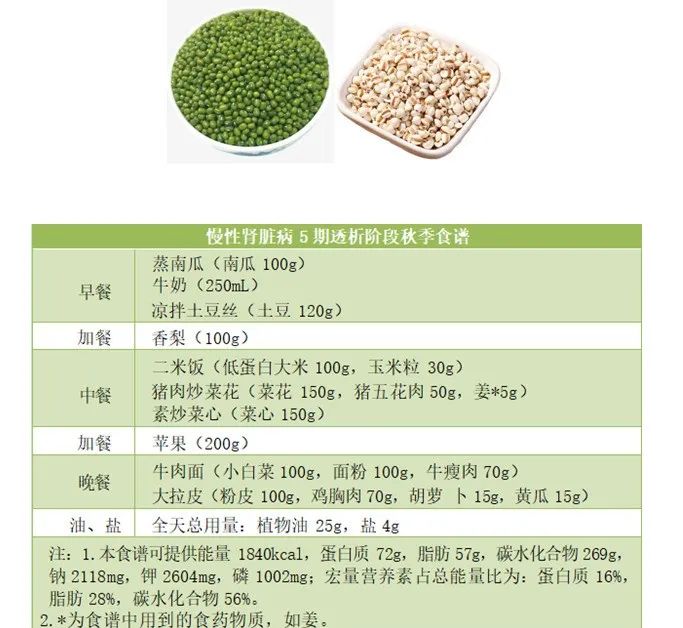 按照成人慢性肾脏病食养指南的基本原则和不同分期的营养管理原则,经过营养成分计算和评估。食谱以轻体力活动 、 理想体重60kg的男性作为参考,按能量系数30kcal/(kg·d)计算全天能量为1800kcal,蛋白质根据0.8g/(kg·d)(慢性肾脏病1~2期),0.6g/(kg·d)(慢性肾脏病3~5期),1.2g/(kg·d)(慢性肾脏病5期透析阶段)进行设计,并尽可能的降低油、盐和肉类使用量。为达到控制蛋白质总量和能量需求,本食谱示例使用的低蛋白大米均为蛋白质含量极低的去蛋白大米。食谱示例仅作为举例说明和参考,具体到每个个体可根据自己的身高、体重、体力活动以及疾病状态计算并调整,患者可寻求营养师或医生进行指导。在此食谱的基础上选择适宜自己症状及证型的食疗方,安排在全天膳食当中,例如:水肿时的气虚湿盛证,我们加以黄芪鲤鱼汤替代部分饮食。主要材料:鲤鱼 500g、生黄芪 30g、赤小豆 30g、大葱白 1 根、生姜 1 块。制作方法:全部食材清洗,浸泡 15 分钟,葱姜切断,不添加盐及其他调味料,水开后小火煎煮 1~2 个小时。鱼汤煎至 100~150mL 为宜。佐餐食用。前文我们推荐过不同症状及证型的慢性肾脏病的食疗方,因此我们可以在此食谱的基础上选择适宜自己症状及证型的食疗方,安排在全天膳食当中,例如:尿频尿急时的湿热下注证,我们加以薏米绿豆汤替代部分饮食。制作方法:薏苡仁、绿豆浸泡 1 小时。取水 600mL,加入薏苡仁、绿豆同煎,大火滚沸后改成中小火至绿豆煮烂。佐餐食用。在此食谱的基础上选择适宜自己症状及证型的食疗方,安排在全天膳食当中,例如:贫血时的气血亏虚证,我们加以桂圆红枣粥替代部分饮食。主要材料:大米 50g、龙眼肉 12g、大枣 12g、莲子肉12g。制作方法:将龙眼肉、大枣、莲子肉洗净,大枣去核对半切开备用。大米淘洗后,加入适量清水,将所有材料放入,煮熟即可。佐餐食用。