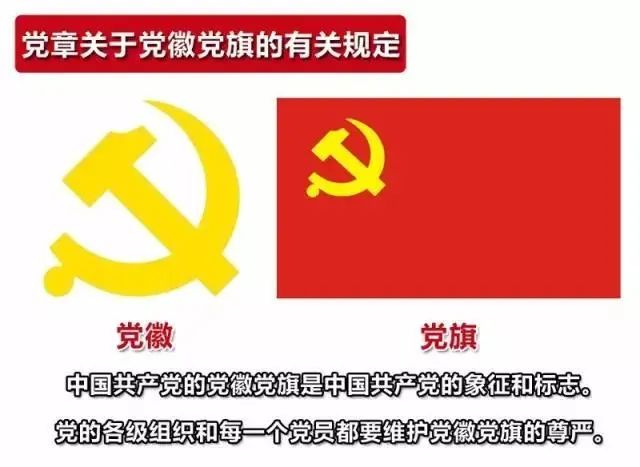 《党章》第五十五条规定:“中国共产党的党徽党旗是中国共产党的象征和标志。党的各级组织和每一个党员都要维护党徽党旗的尊严。要按照规定制作和使用党徽党旗。”