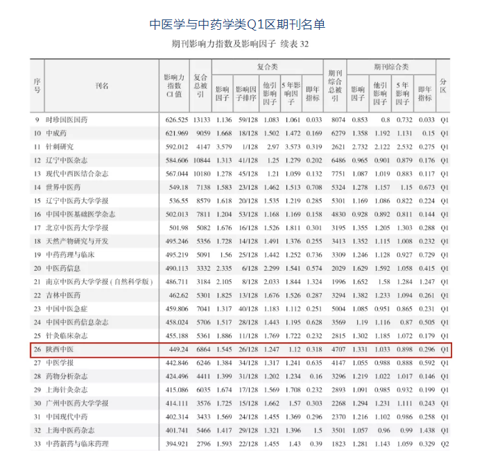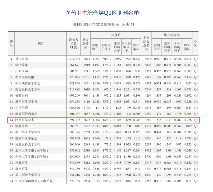近日,中国科学文献计量评价研究中心(中国知网)出版的《中国学术期刊影响因子年报(自然科学与工程技术·2021版》(简称《年报》)正式发布。《陕西中医》《陕西医学杂志》再创佳绩,双双进入《年报》Q1区名单。