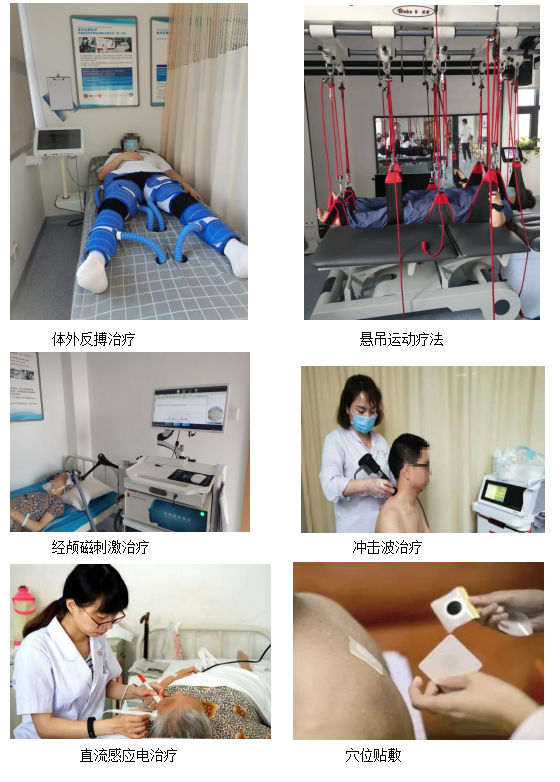 科室运用针灸推拿、艾灸刮痧、刃针筋膜松解术、关节松动术、神经松解术、内脏筋膜松解术、冲击波及可视化针刀技术等手段治疗肌骨及运动创伤康复,治疗颈椎病、肌筋膜炎、肩周炎、足跟痛、腰椎间盘突出、梨状肌综合征、膝骨关节病、网球肘、腱鞘炎、足踝扭伤、各关节肌腱及韧带损伤等;采用运动疗法、言语吞咽训练、面部功能训练、新Bobath概念疗法、生物反馈神经肌肉刺激工作站、生物刺激反馈仪、上下肢主被动康复训练器等治疗神经系统疾病康复,如脑梗死、脑出血、颅脑外伤、脊髓损伤、脊髓炎、格林-巴利综合征、帕金森、周围性面瘫、外周神经损伤等;在内科疾病康复方面,可治疗失眠、头痛、胃脘痛、急慢性胃炎、腹泻、便秘、偏头痛、眩晕、耳石症、慢性疲劳综合征、痛经等;在盆底及产后疾病方面,可治疗盆底肌功能障碍、压力性尿失禁、急迫性尿失禁、混合性尿失禁、阴道壁脱垂、子宫脱垂、产后骨盆带疼痛、产后身痛、产后肥胖、产后腹直肌分离、骨盆不正等疾病;在儿科疾病方面,可治疗如小儿消化不良、腹痛、便秘、泻泄、小儿肌性斜项、青少年近视等;另外还可以进行体态矫正,如青少年脊柱侧弯、骨盆倾斜(长短腿)。