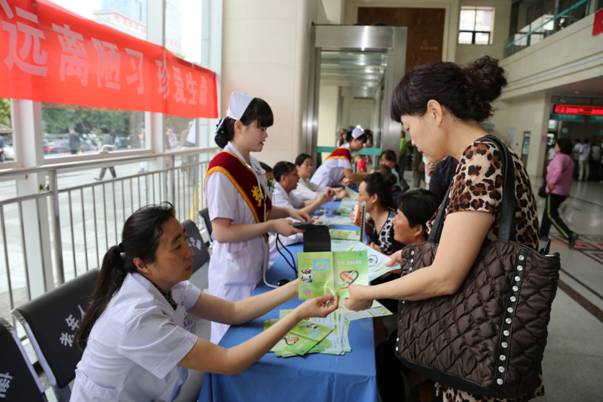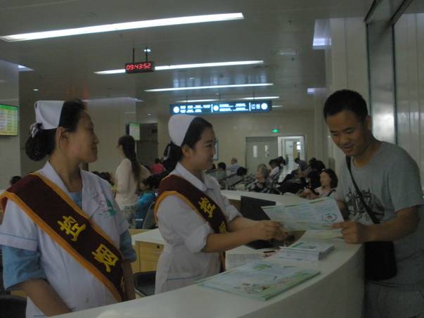 活动中礼仪护士胸前佩戴“控烟天使”飘带,为前来就诊的广大患者及家属提供健康咨询服务,测量血压和发放控烟资料。