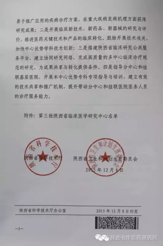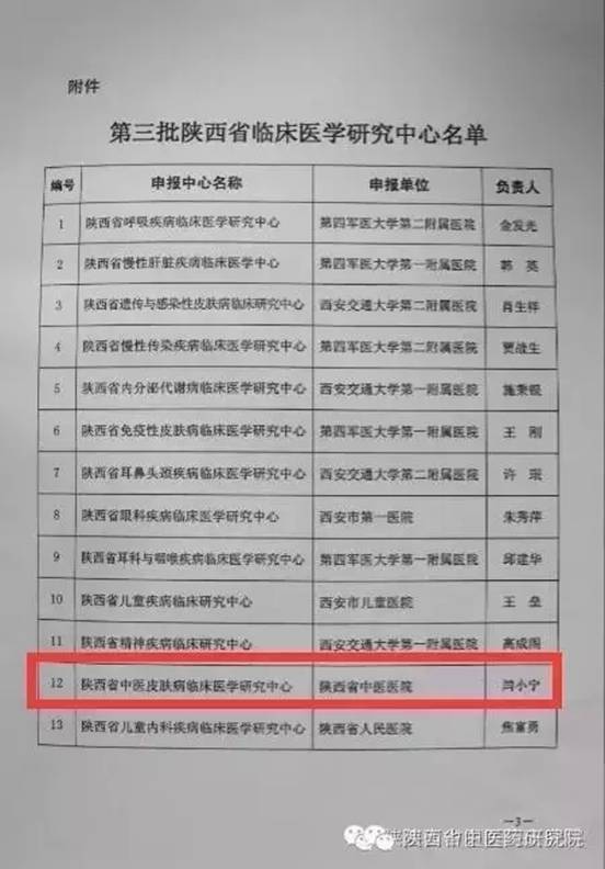 陕西省临床医学研究中心由陕西省科技厅联合陕西省卫生和计划生育委员会评审,陕科社发[2015]219号文件批准,陕西省中医皮肤病临床医学研究中心设在了陕西省中医医院,这再一次显示了陕西省中医医院皮肤病医院在全省中医及中西医结合同行中的龙头地位。