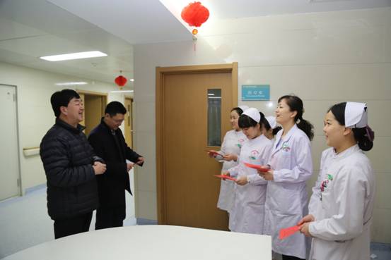 正月初一(1月28日)8时30分,院长刘力、副院长于辉瑶、许建秦、毕宇峰等院领导带领院办、党办、医疗处、科研处等部门负责同志分别深入临床科室、护理单元、水、电工班、氧气房、收费大厅和各医技科室慰问节日期间坚守工作岗位的医生、护士和工作人员,向他们分送慰问品,了解节日工作情况,欢度春节,并祝大家新年快乐、阖家欢乐!