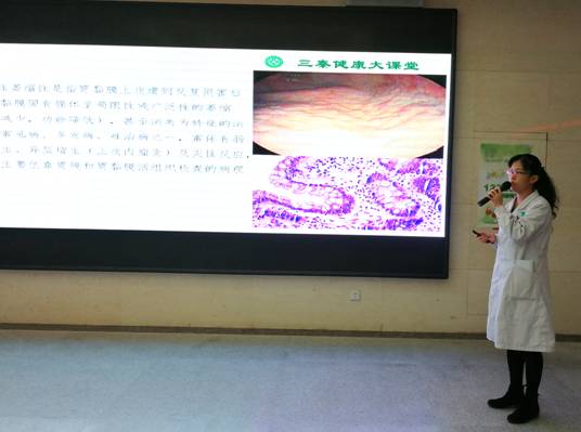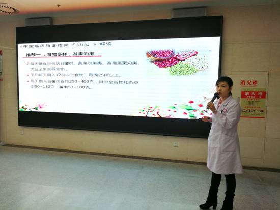 在住院大厅,《三秦健康大课堂》12320专题普知识讲座也在同步进行。讲座分别由营养科尹薇营养师和干保二科寇媛副主任医师担任主讲。尹薇营养师结合自身专业从“中国居民膳食指南2016”、“如何读懂食品标签”、“了解您的健康餐桌”等方面向患者朋友及社会大众讲解了合理膳食的相关知识;寇媛副主任医师结合临床经验,从慢性萎缩性胃炎的病因、中医调养、饮食原则等方面向患者朋友及社会大众讲授了“慢性萎缩性胃炎的中医预防和调摄”,受到了患者朋友的一致好评。