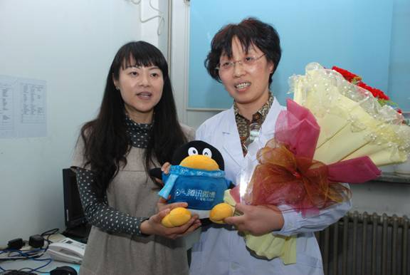 这是3月8日上午,在陕西省中医医院干部保健科医生办公室里,大秦网总监吴菁女士为王凌同志颁发了“大秦巾帼榜——巾帼贡献奖”奖杯,王凌手捧奖杯与鲜花,面对记者所说的话。