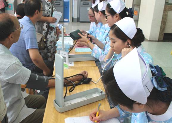 义诊护士为患者测量血压