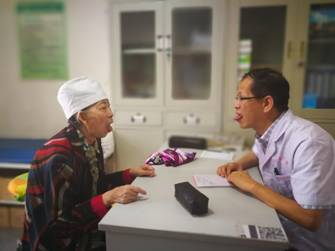 于辉瑶副院长接诊盘峰村卫生室预约的患者,并指导村医(右二)临床诊疗