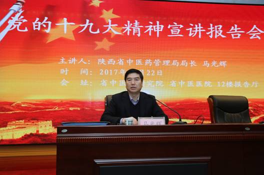 马光辉同志结合自身学习感悟,对党的十九大精神作了精彩生动的报告。他紧紧围绕党的十九大关于新时代、新思想、新目标、新征程的重大判断和第二个百年目标“两步走”的战略部署,全面阐述了党的十九大主题、重要成果、主要精神和历史贡献,突出强调学懂、弄通、做实党的十九大精神,最重要的是学习贯彻习近平新时代中国特色社会主义思想,这是十九大精神的灵魂,是我们把握十九大精神的“纲”,是我们做好一切工作的主线。他说,党的十九大把习近平新时代中国特色社会主义思想确立为党的指导思想,实现了党的指导思想又一次与时俱进;十九大深刻总结了过去5年的历史性成就和历史性变革,为在新的历史起点上推进党和国家事业提供了重要启示和宝贵经验;十九大作出关于中国特色社会主义进入了新时代的重大政治论断,明确了我国发展新的历史方位;十九大提出我国社会主要矛盾已经转化为人民日益增长的美好生活需要和不平衡不充分的发展之间的矛盾,明确了今后一个时期全党工作的战略重点和主攻方向;十九大作出了“两步走”“两个阶段”的战略安排,明确了全面建成社会主义现代化强国的时间表和路线图;十九大对我国经济社会发展作出重大战略部署,明确了当前和今后一个时期党和国家工作的战略重点和重大举措;十九大明确提出新时代党的建设总要求,为把全面从严治党引向深入指明了方向。同时,还就党的十九大报告中提出的“坚持中西医并重,传承发展中医药事业”“深化医药卫生体制改革,全面建立中国特色基本医疗卫生制度、医疗保障制度和优质高效的医疗卫生服务体系,健全现代医院管理制度”“积极应对人口老龄化,推进医养结合”的新要求,结合中医药传承、发展、创新进行了全面解读,提出了很好的建议。马光辉同志的报告既是对十九大精神的深入宣讲,也是对陕西中医药系统学习宣传贯彻党的十九大精神的动员部署,具有很强的理论性、政策性、针对性和指导性。马光辉同志的精彩宣讲引发了大家的强烈共鸣,赢得了全场热烈掌声。