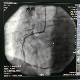 11月21日上午11:30分许,患者高某在家属陪同下来我院急诊科就诊,当班医生车玲艳主治医师接诊后详询病史,患者自述突发胸痛、胸闷,逐转至抢救室,给予心电监护、吸氧,建立静脉通路,床旁查体,急查心电图及相关实验室检查,心电图结果提示急性下壁心肌梗塞,上报科主任,立即抢救,急请心病科会诊,当班医生一边说一边展开抢救。屈小元主任医师立即组织抢救,在予扩管、抗凝、抗血小板等药物治疗后,患者胸痛症状稍有缓解。心内科张笑峥副主任医师会诊后建议立即行急诊介入手术,家属救治态度积极,患者被紧急转至导管室进行PCI,术中患者出现再灌注后心律失常,张广平副主任医师等人积极抢救治疗,成功开通闭塞血管,完成右冠脉内支架置入,术后患者情况稳定,转入心病科病房进行监测及后续治疗。