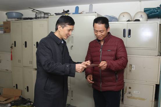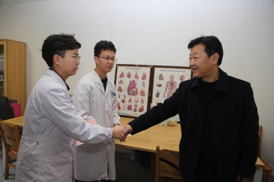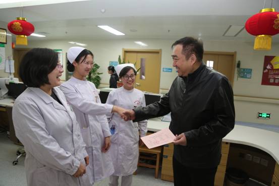 正月初一(2月16日)8时30分,院长刘力、党委书记李玉明、副院长于辉瑶、副院长许建秦、党委副书记、纪委书记刘小宾、副院长毕宇峰等院领导带领院办、党办、科研处、护理部、总务处等部门负责同志分别深入临床科室、护理单元、水、电工班、氧气房、收费大厅和各医技科室慰问节日期间坚守工作岗位的医生、护士和工作人员,给他们拜年,恭贺新春!院领导向他们分送慰问品,了解节日工作情况,欢度春节,并祝大家新年快乐、阖家欢乐!期望在新的一年里,全院各项工作再创佳绩!