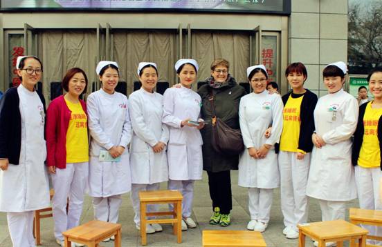 义诊现场,康复护理学组组长杨海侠护士长带领各位护理人员测血压、接待患者咨询、发放健康教育资料,现场教学“安神操”,许多患者、群众纷纷加入到做操行列,演示结束后还对参与学习的患者进行一对一指导。活动还吸引了国际友人一同学习“安神操”,并向护理人员请教中医知识。