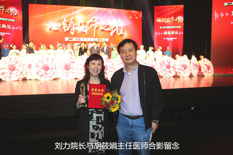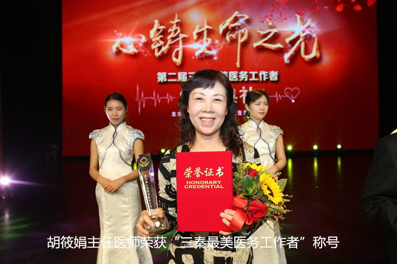 2018年4月24日下午,“心铸生命之光光第二届三秦最美医务工作者”颁奖典礼在西安易俗大剧院举行。国家卫生健康委宣传司、省委宣传部、省卫生计生委领导出席典礼并颁奖,省卫生计生委主任刘宝琴致辞。我院内分泌科主任胡筱娟荣获陕西省第二届“三秦最美医务工作者”称号,刘力院长带领医护人员方阵出席颁奖典礼并与胡筱娟主任医师合影留念。