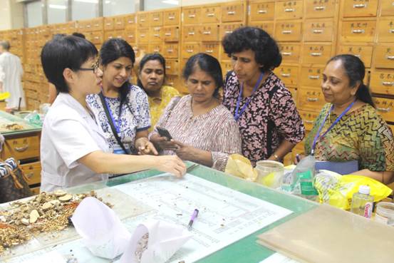 研修班一行先后参观了针灸推拿康复科门诊、药剂科中草药房,观摩了针灸治疗、拔罐、温灸刮痧、热熨等特色中医传统治疗,体验了中医降压操、颈椎操等项目,研修班学员们对医院的发展规模、中医的确切疗效赞不绝口。