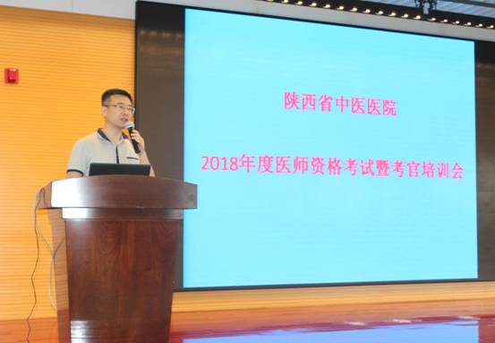 为迎接即将到来的国家执业医师资格实践技能考试,提升我院作为考试基地考官规范化执考水平及能力,进一步严肃考风考纪,确保考试顺利进行,6月6日上午,陕西省中医医院组织举行举办了国家执业医师资格考试考官培训,并在会上对参加培训的考官进行了现场考核。医疗管理处处长路波主持培训会,全院符合考官资质的70余名医师参加了本次活动。