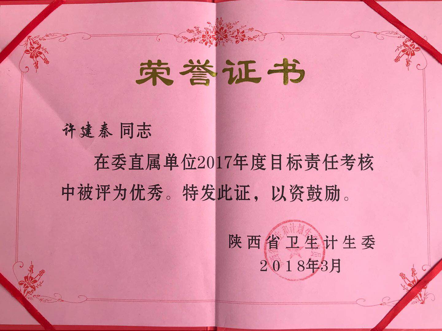 接陕西省卫生和计划生育委员会《关于表彰2017年度目标责任考核优秀处室、单位和优秀人员的决定》(陕卫人发〔2018〕27号),我院荣获陕西省卫生计生委机关和直属单位2017年度目标责任考核优秀单位称号,许建秦副院长在委直属单位2017年度目标责任考核中被评为优秀。