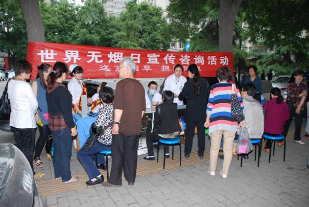 2013年5月31日是WHO发起的第26个世界无烟日,本次世界无烟日的主题是“禁止烟草广告、促销和赞助”。为进一步强化全社会对烟草危害的认识,提高人们的烟草防控意识,我院于当天上午在人流量较大的医院大门前举行了以 “远离烟草,呵护健康” 为主题的大型控烟宣传、咨询、发放控烟宣传材料等活动。