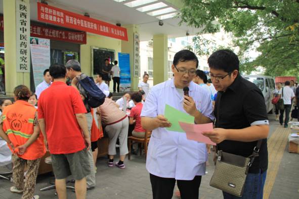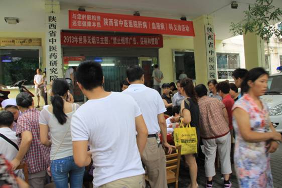 上午8点,义诊现场就已聚集了许多前来咨询、就诊的群众。陕西省首批名老中医专家张瑞霞主任医师亲临现场,带领肝病科薛敬东主任,李粉萍副主任等多位主任医师坐诊,现场为市民免费义诊,讲解病毒性肝炎的传播途径及乙肝抗病毒规范治疗知识。4张立式展板前也聚集了不少群众——“肝炎日活动内容”、“乙肝知识介绍”、“肝病科简介”等,最热闹的当属“现场问卷调查展板”——您认为乙肝病毒会通过一起吃饭传染吗?如果你知道身边的人感染了乙肝病毒,你会怎样?听了专家的讲解之后,大家接过工作人员递过来的制作精美的小卡片,郑重的写上自己的名字,粘贴到答案上;许多群众认真地在活动横幅上签名,支持反对乙肝歧视。