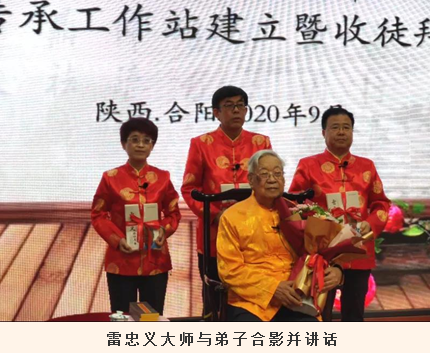 签约授牌仪式后,现场举行了隆重庄严的传统拜师仪式,仪式由合阳县原县委宣传部副部长、县文联主席雷建学主持。合阳县中医医院刘军昌、李水刚、刘桂芳三名学生共同向雷忠义国医大师呈上拜师帖,行拜师礼、敬茶礼,雷忠义国医大师给三位弟子赠书、寄语,共同诵读了药王孙思邈的经典著作《大医精诚》,并与弟子亲切合影。