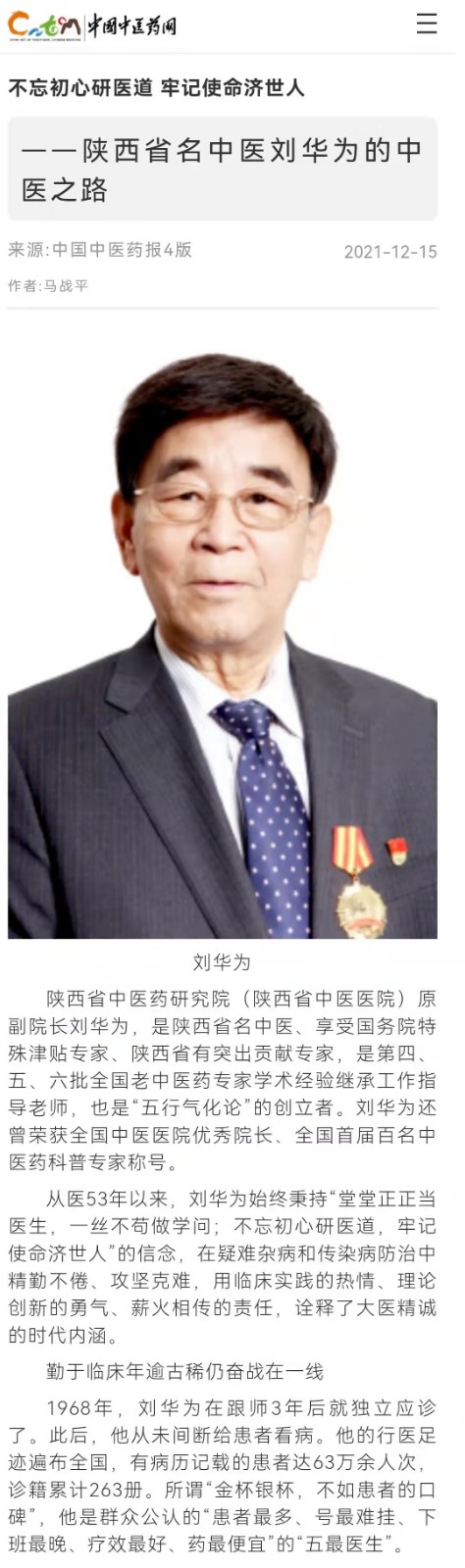 陕西省中医药研究院(陕西省中医医院)原副院长刘华为,是陕西省名中医、享受国务院特殊津贴专家、陕西省有突出贡献专家,是第四、五、六批全国老中医药专家学术经验继承工作指导老师,也是“五行气化论”的创立者。刘华为还曾荣获全国中医医院优秀院长、全国首届百名中医药科普专家称号。