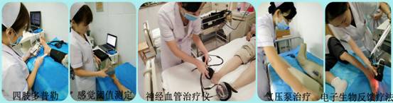科室配备经皮氧分压测定仪、糖尿病足诊断箱等,可有效评估肢体血液循环、代谢障碍情况;同时拥有糖尿病足治疗仪、毫米波治疗仪、中频脉冲治疗仪、空气压力波治疗仪等先先进设备,可一定程度改善下肢血液循环、周围神经代谢,促进溃疡愈合等。